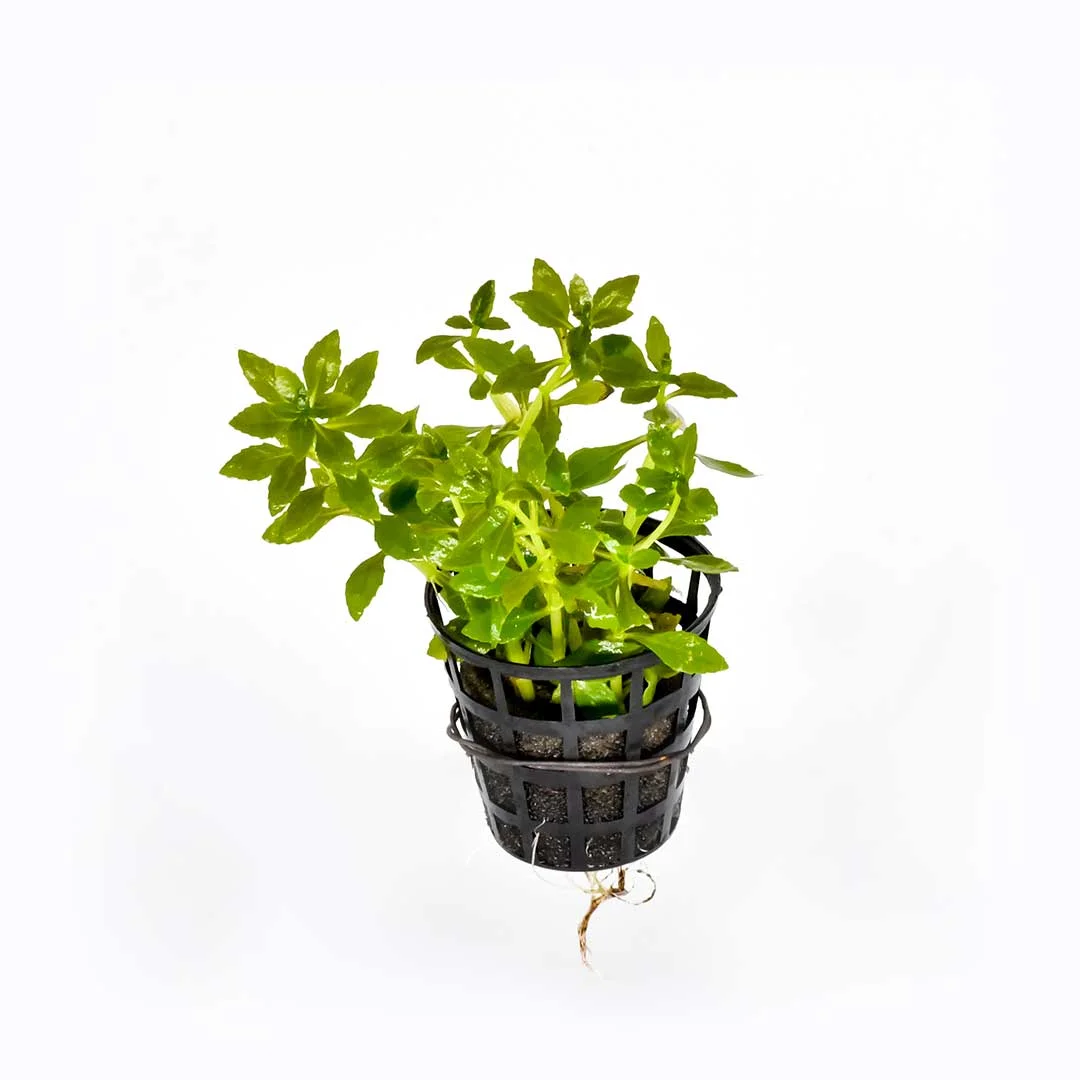 This plant is more or less similar to L. aromatica with respect to aroma and leaf shape, but compact in nature and can pe placed in midground position in aquariums. When they grow above water, they produce green elliptical leaves with serrated margins. The leaves at the top of the stem turn deep pink on upper side under bright conditions in aquarium. Nutrient rich substrate is mandatory for its vibrant growth as it develops very strong root system like its original version L. aromatica