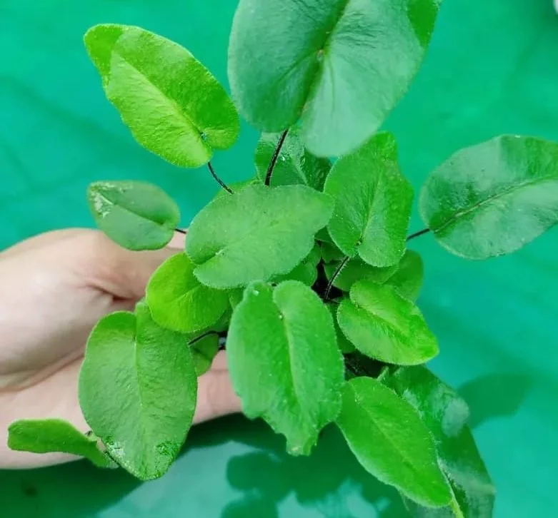One of the loveliest ferns out there.Its leaves start as black string-like stems covered in thin hair that eventually protrude to reveal a small leaf. Unlike other ferns that grow from a crozier that uncoils, the leaf continuously grows into a matured form.The Heart fern is partly epiphytic and can grow without any soil